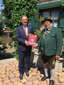 Rochus Nickl (Sparkasse Allgäu, links) nimmt die neue Chronik von Walter Sirch (1. Gauvorstand) entgegen.