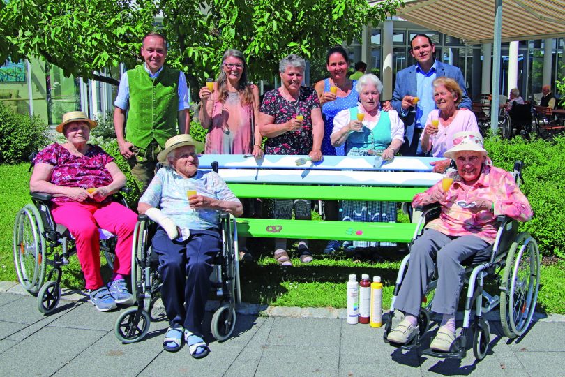 Das Seniorenheim Priental in Aschau i.Chiemgau ist ab sofort stolzer Besitzer eines weiteren Bankerl mit der Bezeichnung „Dahoam is Dahoam“. Neu ist es ja nicht das Bankerl, das seit 5 Jahren an der Bahnhofstrasse gegenüber dem Seniorenheim steht und die Fußgänger im Bankerldorf Aschau i.Chiemgau einlädt Platz zu nehmen. Allerdings wurde es inzwischen renovierungsbedürftig und so überlegten sich Aschaus Tourismuschef Herbert Reiter (links) und Cristina Wimmer (Vierte von links – stehend) als Mitarbeiterin vom Seniorenheim Priental, es in das Heim zu holen und mit den Bewohnern zu renovieren. Über mehrere Wochen nahm dann das Bankerl auf dem Tisch der Seniorenmal-Gruppe im Wintergarten Platz und wurde liebevoll restauriert. Bei bester Laune über das geschaffene Werk der Senioren wurde dann das Prachtstück bei einer Bankerl-Hebfeier seiner Bestimmung übergeben. Noch steht es in Garten vom Seniorenheim Priental und viele Bewohner nutzen die farbenfrohe Sitzgelegenheit zum Ausruhen und Genießen. Bald jedoch wird es wieder an seinem Ursprungsplatz an die Bahnhofstrasse zurückkehren und alle Passanten zum Verweilen einladen. Weitere Infos zum Bankerldorf und das kostenlose Faltblatt gibt es bei der Tourist Info Aschau i.Chiemgau, Tel. 08052/90490 bzw. unter www.aschau.de