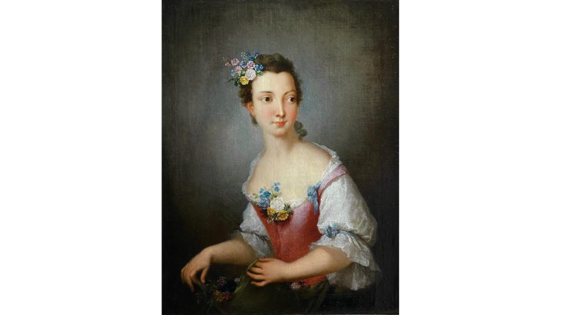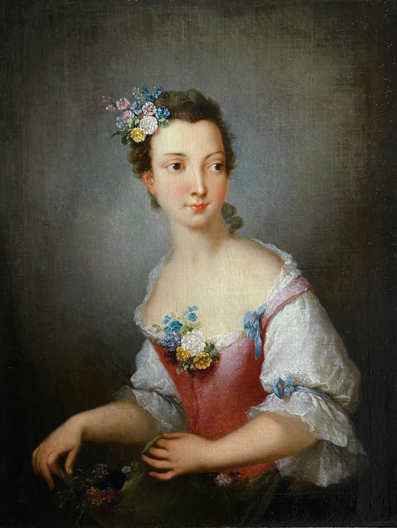 Glücklicherweise konnte der Gemälde-Restaurator Jürgen Jung in Oberaudorf, durch Reinigen und Beseitigen von alten Übermalungen, das Gemälde im neuen alten Glanz und mit sichtbar gewordener Signatur wieder erstrahlen lassen. Das Bildnis im Dreiviertelportrait, dargestellt eine schöne junge Frau, die als Flora personifiziert ist, gehört zu den wenigen einzelnen Bildnissen von Frauen, die Dietrich ganz nach dem höfischen Genre-Geschmack des Rokokos um 1760 gemalt hat. Wieder mal zeigt Dietrich seine künstlerische Meisterschaft mit dem Pinsel und Farben, so wie seine Präzision von Blumen und Stofflichkeit, wie er die Portraitierte in voller Anmut und Schönheit wiedergibt.