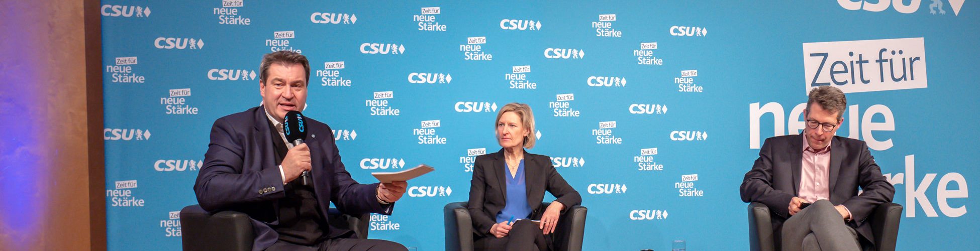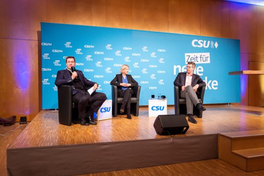 Ministerpräsident Markus Söder, Landtagspräsidentin Ilse Aigner, CSU Generalsekretär Markus Blume und Europaparlament-Abgeordnete Angelika Niebler sind ins Ku’Ko gekommen, um mit der Parteibasis ins Gespräch zu kommen. Der Diskussionsabend war teil einer breit angelegten Basistour für alle Mitglieder in ganz Bayern unter dem Motto „Zeit für neue Stärke“. “Wir touren durch Bayern, um Motivation und Innovation zu schaffen”, sagte Söder vorab bei einem Pressegespräch im Ku’Ko. Auch wolle man im Hinblick auf die Europawahl Motivation für die europäische Idee schaffen.