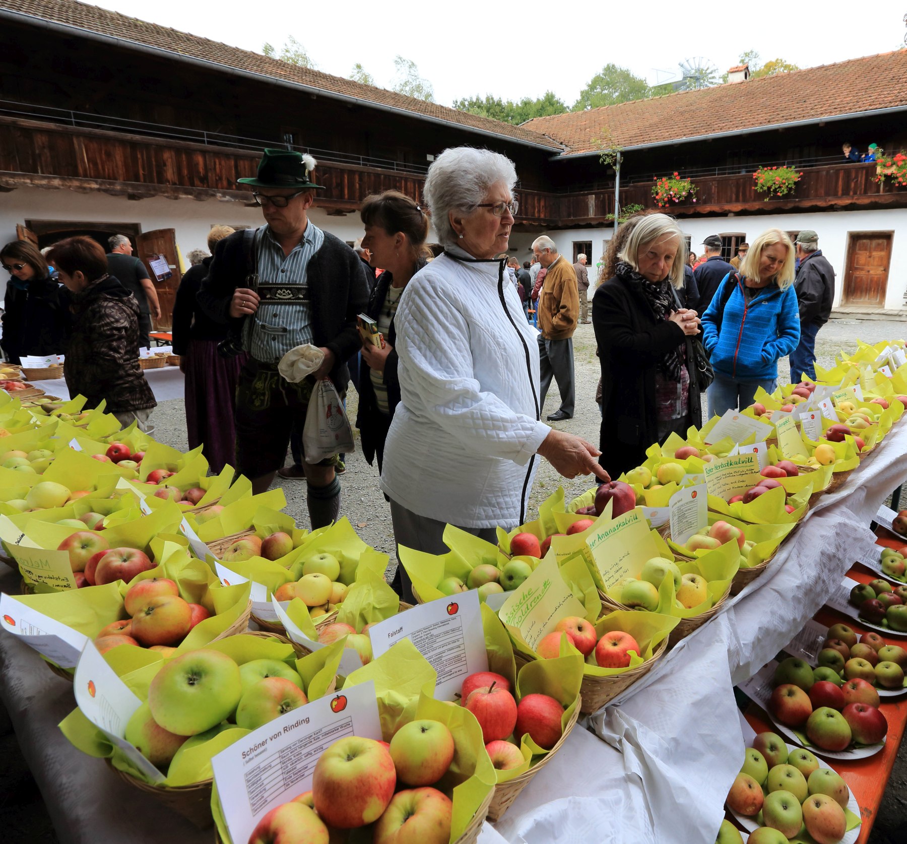 Die Pomologin Maria Seidinger präsentiert mehr als 100 alte Sorten aus ihrem Obstgarten und bestimmt fachkundig mitgebrachte Äpfel und Birnen der Besucher. © Bezirk Oberbayern, Archiv BHM, Fotografie Gerhard Nixdorf.