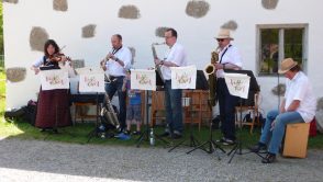 - BHM_kreiz und quer.jpg: Das Wasserburger Quintett Kreiz und Quer spielt am Maifest im Bauernhausmuseum Amerang zum Frühschoppen auf. © Bezirks Oberbayern, Bauernhausmuseum Amerang.