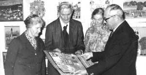 Max Raffler mit seinen Schwestern Fanny, Maria und dem damaligen Pfarrer Wolfgang Schmid in einer Ausstellung im Greifenberger Pfarrsaal, 1982
