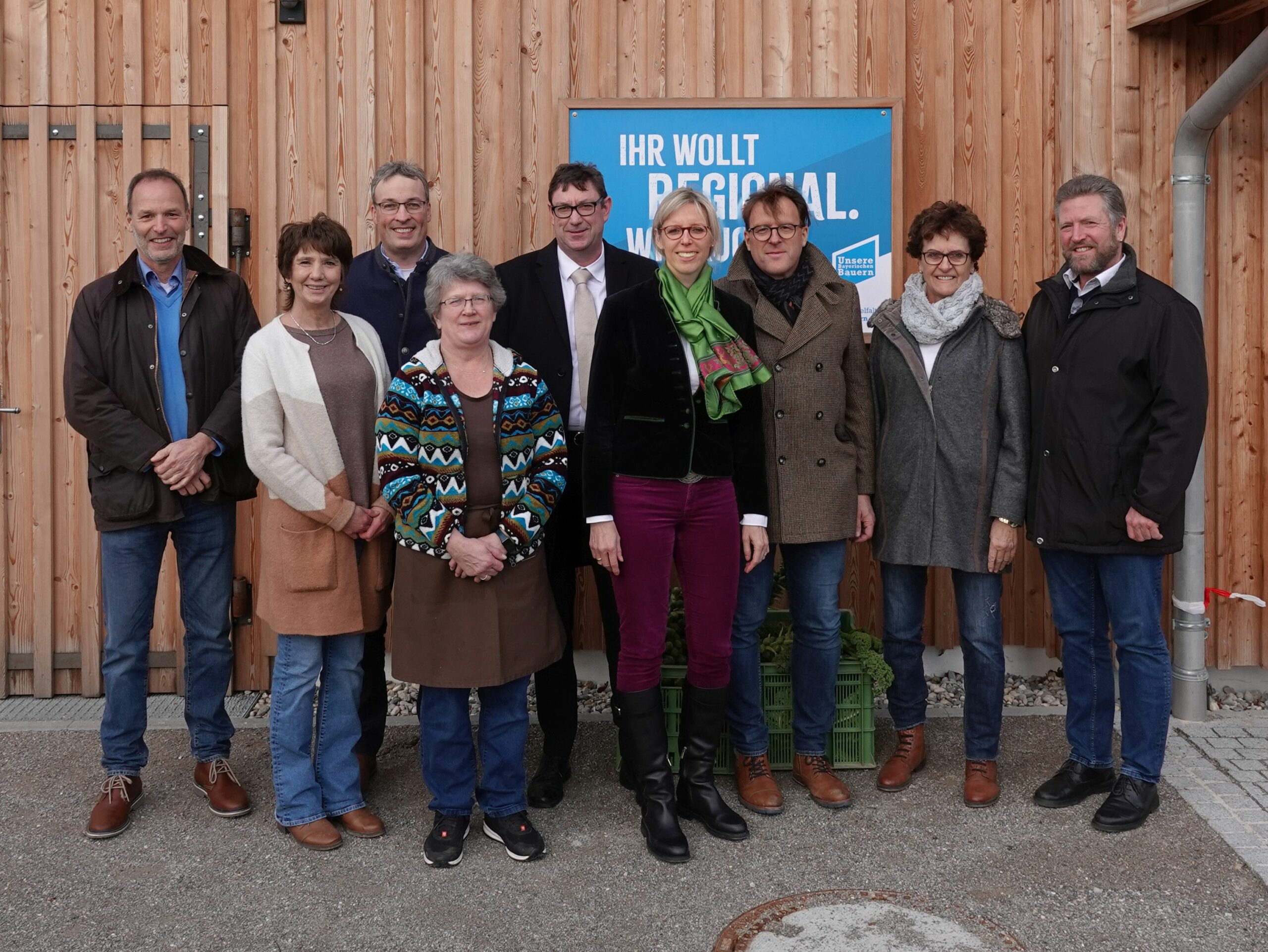(vlnr): Reinhard Menzel (Behördenleiter Amt für Ernährung, Landwirtschaft und Forsten Ebersberg-Erding), Monika Mayr (FB Gruppe LiLED), Michael Hamburger (Sprecher FB Gruppe LiLED), Christine Heigl (Marktsprecherin Bauernmarkt Erding), Martin Bayerstorfer (Landrat), Eva-Maria Haas (Geschäftsführerin Unsere Bayerischen Bauern), Dr. Thomas Bauer (Fraktionsvorsitzender Kreistag Erding), Elisabeth Mayr (Ehrenkreisbäuerin) und Robert Grimm (FB Gruppe LiLED)