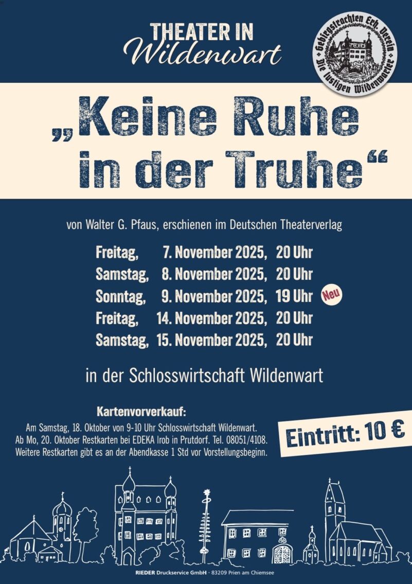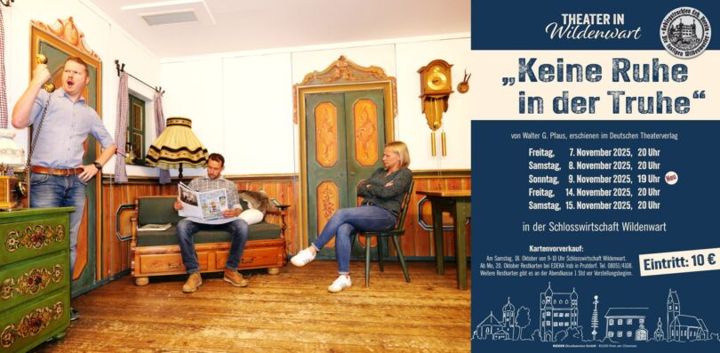 Heuer gibt es insgesamt fünf Theatervorstellungen in Wildenwart, diese sind am Freitag, 7. November, am Samstag, 8. November, am Freitag, 14. November und am Samstag, 15. November jeweils ab 20 Uhr. Neu ist eine weitere Aufführung am Sonntag, 9. November bereits ab 19 Uhr. Der Kartenvorverkauf für alle fünf Veranstaltungen hat bei EDEKA Irob in Prutdorf, Telefon 08051-4108 bereits begonnen. Restkarten sind dann auch noch an den Veranstaltungsabenden eine Stunde vor Vorstellungsbeginn zu bekommen.