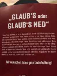 Es ist kaum zu glauben: beim Wildenwarter Bauerntheater vom örtlichen Trachtenverein “Die lustigen Wildenwarter” gibt es kaum Pausen des Lachens und Staunens. “Glaub´s oder Glaub´s ned” – so heißt die himmlisch-höllische Komödie in drei Akten.