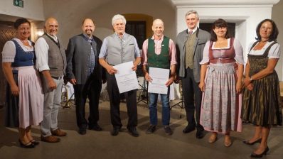 Diese Ortsobmänner waren 15 Jahre ununterbrochen im Amt und wurden von Kreisbäuerin Katharina Kern, ihrer Stellvertreterin Maria Fischbacher (v. li. na. re.), Bezirkspräsident Ralf Huber, stellvertretende Bezirksbäuerin Elisabeth Mayerhofer und Kreisobmann Josef Andres (v. re. na. li.) mit einer Urkunde und der Silbernen Ähre ausgezeichnet. Zu den Geehrten gehörte auch stellvertretende Kreisobmann Klaus Gschwendtner (5. v. re.).