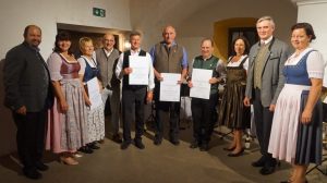 Mit der Ehrennadel für 25-jährige Tätigkeit als Ortsbäuerin bzw. Ortsobmann wurden ausgezeichnet: v. li. na. re. mit Urkunde Irmgard Inninger aus Freiham, Bernhard Huber aus Rohrdorf, Josef Pöschl als Utzenbichl und Georg Hainz aus Kling. Kreisobmann Josef Andres, stellvertretende Bezirksbäuerin Elisabeth Mayerhofer, Bezirkspräsident Ralf Huber, Kreisbäuerin Katharina Kern, stellvetretender Kreisobmann Klaus Gschwendtner und stellvertretende Kreisbäuerin Maria Fischbacher (v. li. na. re.) gratulierten herzlich.