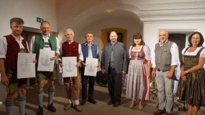 Kreisbäuerin Katharina Kern, Bezirkspräsident Ralf Huber, stellvertretende Bezirksbäuerin Elisabeth Mayerhofer und Kreisobmann Josef Andres dankten den Ortsobmännern, die 15 Jahre ununterbrochen im Amt sind mit der Auszeichnung “Silberne Ähre”.