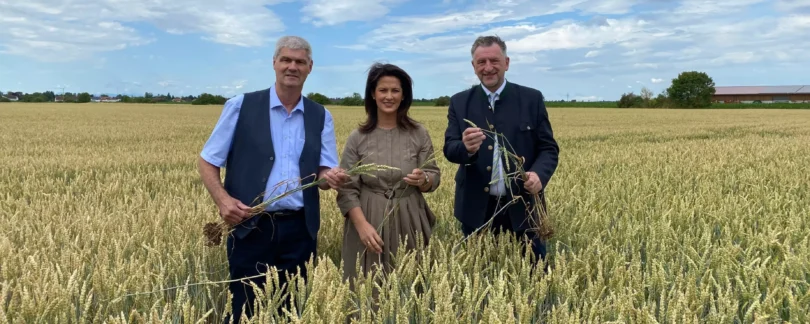 Bericht und Foto: BBV – Ernte-Pressefahrt in Baldham, Landkreis Ebersberg: Landwirtschaftsministerin Michaela Kaniber, der BBV-Präsident Günther Felßner (r.) und BBV-Getreidepräsident Hermann Greif (l.) informierten über den aktuellen Vegetationsverlauf der Ackerkulturen und gaben einen Ausblick auf die kommende Ernte in Bayern.