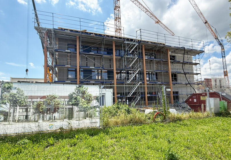 Von einem mobilen Notdach vor Regen geschützt, werden aktuell die Fassadenelemente aufgestellt. Auch die ersten Fenster des dreigeschossigen Holzbau-Hybridbaus werden bereits eingebaut. Der bereits fertiggestellte Teil der Fassade, Ecke Mariä-Himmelfahrt-Straße/Harthauser Straße, vermittelt schon jetzt einen guten Eindruck davon, wie das Gebäude später einmal aussehen wird.