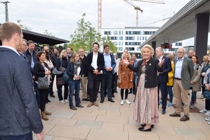 Auf einer abteilungsübergreifenden Fortbildungsfahrt besichtigten Mitarbeiterinnen und Mitarbeiter des Bayerischen Staatsministeriums für Wohnen, Bau und Verkehr um Ministerialrätin Evelin Lux das Bahnareal Nord in Rosenheim, um sich vor Ort ein Bild vom Einsatz staatlicher Fördermittel zu verschaffen. Oberbürgermeisterin Gabriele Bauer, Baudezernent Helmut Cybulska und Stefan Ludwig, Geschäftsführer der GRWS, begrüßten die Delegation und führten sie über das Bahnhofsgelände.