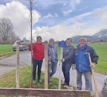 Fotos: Obst- und Gartenbauverein – 1. Baumpflanzung der Obst- und Gartenbauvereins-Vorstandschaft von links Gerlinde Mayer (Beisitzerin), Irmi Wallner (Schriftführerin), Regina Stuffer (Beisitzerin) und Simon Mayer (Erster Vorstand). 2. Zum Wohl auf den neuen Baum von links Vorstand Simon Mayer sowie die Grundstücksbesitzer Roswitha und Konrad Estermann. 3. Schild zur Baumspende.