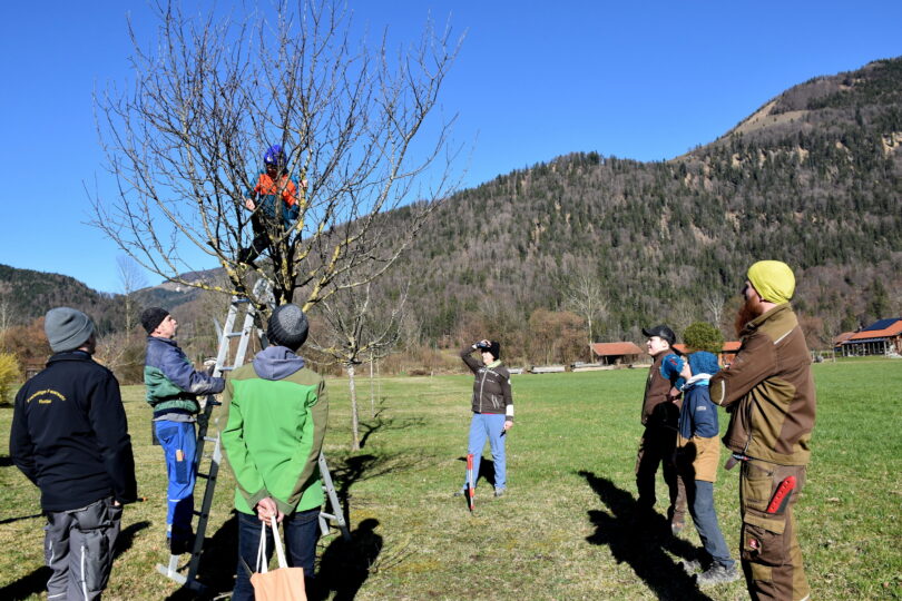 Die erste Frage „Warum müssen Obstbäume beschnitten werden?“ konnten die Besucher fast noch selbst beantworten, mit „stabiles Gerüst damit die Äste nicht abbrechen“ oder „lockere Krone, damit viel Licht und Luft ankommt“. Das trifft zum Beispiel zu bei der Empfehlung von Johanna Hörfarter, der Pyramidenkrone, auch „Oeschbergkrone“ genannt. Es ging dann sogleich ans Werk bei einem Apfelbaum, der gelichtet werden musste. Johanna Hörfarter hatte auch noch drei von ihren Schülern dabei, die Brüder Stefan und Sebastian aus Unterwössen und Martin aus Reit im Winkl. Auf die Frage was die jungen Buben von zehn und zwölf Jahren motivierte an ihrem freien Tag frühmorgens zu so einem Kurs zu kommen, war die klare Antwort, wir wollen wissen wie es geht und zuhause mit unseren Bäumen alles richtig machen. Martin kletterte dann auch gleich auf die Leiter und in den Apfelbaum und entfernte mit der Säge, nach den Kommandos von unten, die störenden Äste. Alle Beteiligten machten sich Gedanken, wie am sinnvollsten die Pyramidenkrone entstehen kann. Zum Schluss waren alle mit ihrem Werk zufrieden und konnten sich mit einer Brotzeit stärken. wun