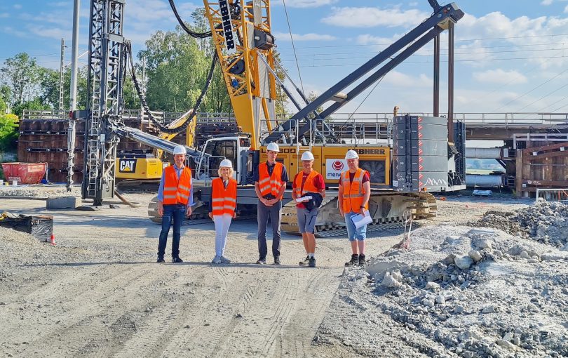 Die große Herausforderung: Der Bau der Brücke passiert im laufenden Bahnbetrieb. „Wir pressen Spundwände in den Boden, und dürfen dabei nicht rütteln. Wir können es uns nicht leisten, dass sich das Gleis hebt, und der Bahnverkehr ruht. Das ist eine Hauptader Richtung Süden, in Richtung der Seehäfen, da würde ein Milliardenschaden entstehen“, erläuterte Projektleiter Alexander Zett. „Täglich rollt eine Last von 320.000 Tonnen über die Behelfsbrücken – das ist die Last wie bei einer Autobahn.“