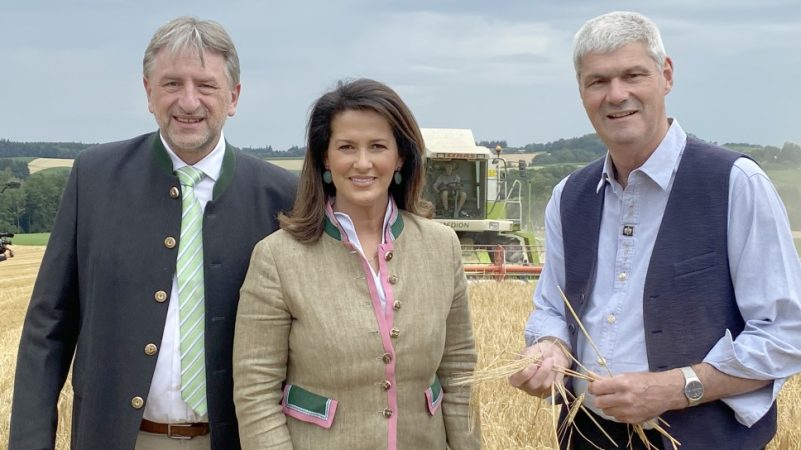 Dazu Günther Felßner, Vizepräsident des Bayerischen Bauernverbandes bei der gemeinsamen Erntepressefahrt mit der bayerischen Landwirtschaftsministerin Michaela Kaniber in Lengdorf im Landkreis Erding: