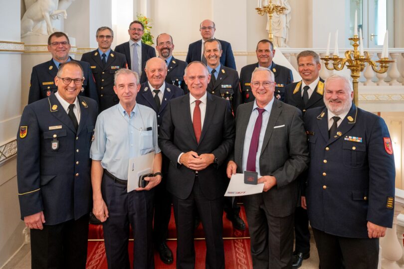 Untere Reihe v. l. n. r.: 1.Vorsitzender des Landesfeuerwehrverbandes Bayern e.V., Johann Eitzenberger, Regierungsrat Christian Krol ADIR, Bundesinnenminister Gerhard Karner, Hofrat DDr. h.c. Mag. Dr. Josef Siegele, 1.vorsitzender Bezirksfeuerwehrverband Oberbayern Dr. Rüdiger Sobotta
