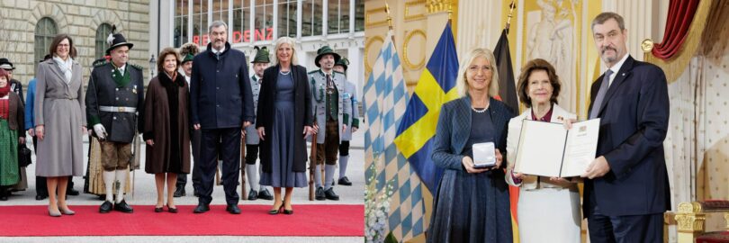 Ihre Majestät Königin Silvia von Schweden ist von Bayerns Sozialministerin und stellvertretenden Bayerischen Ministerpräsidentin Ulrike Scharf mit der Bayerischen Staatsmedaille für soziale Verdienste ausgezeichnet worden. Damit würdigte Scharf den Einsatz der Monarchin für die von ihr 1999 gegründete World Childhood Foundation. Der Festakt fand im Thronsaal der Residenz in München statt. Zuvor war Ihre Majestät Königin Silvia von Bayerns Ministerpräsident Dr. Markus Söder und seiner Stellvertreterin Ministerin Scharf empfangen worden. Am Festakt nahmen unter anderem auch Seine Königliche Hoheit Herzog Franz von Bayern, Seine Königliche Hoheit Leopold von Bayern, Ihre Königliche Hoheit Prinzessin Ursula von Bayern und Landtagspräsidentin Ilse Aigner teil.