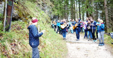 – Der lange Zug der Wallfahrer auf dem Weg von Kössen zur Wallfahrtskirche Maria Klobenstein
