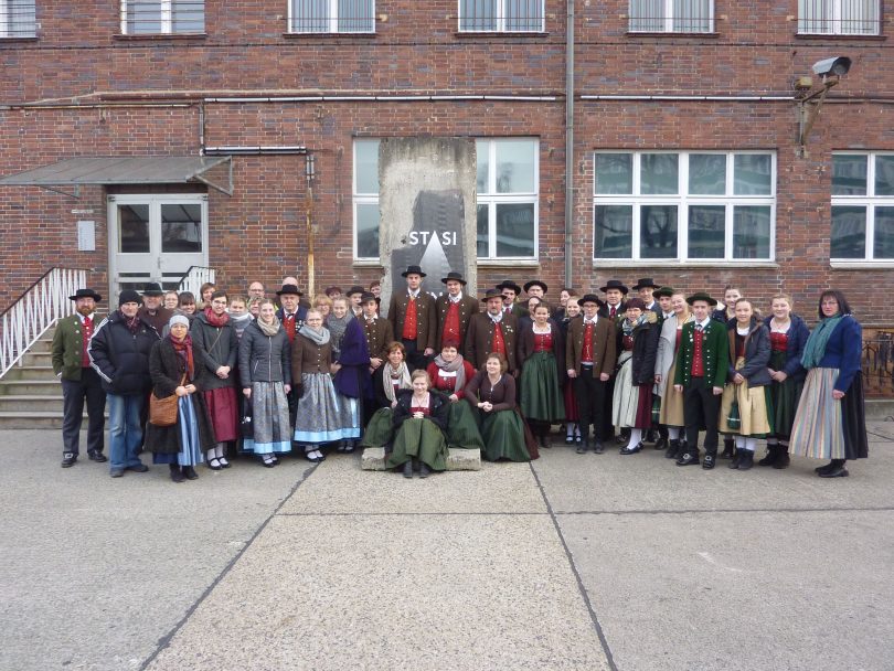 Tief in die deutsch-deutsche Geschichte tauchten die Reisenden am Sonntag ein, denn das ehemalige Untersuchungsgefängnis des DDR-Staatssicherheitsdienstes (Stasi) in Hohenschönhausen stand auf dem Programm. Ein Zeitzeuge (ehemaliger Häftling) führte in einem 90-minütigen Rundgang durch das nahezu vollständig erhaltene Gebäude und schilderte eindrucksvoll die Geschichte der Haftanstalt und seine persönlichen, überaus leidvollen Erfahrungen. Zwischen 1945 und 1989 waren hier über 20 000 politische Häftlinge eingesperrt, bis es 1990 für immer geschlossen wurde. Festgehalten wurden hier vor allem Menschen, die versucht hatten, zu fliehen oder auszureisen oder die wegen ihrer politischen Meinung verfolgt wurden. Die Häftlinge wurden vielfach jahrelang unter katastrophalen Lebensbedingungen in gruftartigen Zellen, von der Außenwelt hermetisch abgeschnitten und von den Mitgefangenen meist streng isoliert, von Drohungen und körperlicher Gewalt begleitet, ohne Gerichtsprozess festgehalten. Durch perfide Verhöre, Schlafentzug, stundenlanges Stehen, tagelangen Arrest in völliger Dunkelheit oder Aufenthalt in Wasserzellen wurden die Inhaftierten zu belastenden Aussagen und Geständnissen gezwungen. Dieses mit Qual und Folter einhergehende Unrechtssystem der DDR ließ keinen der jugendlichen und erwachsenen Trachtler unberührt, ist es doch noch gar nicht so lange her. Nachdenkliche Gespräche arbeiteten das Gehörte bei der Weiterfahrt im Bus auf. Den Nachmittag verbrachte die Gruppe dann am Alexanderplatz in Berlin, im Volksmund „Alex“ genannt. Man genoss von der Panoramaetage (207 Meter) den Blick über Berlin vom Fernsehturm (mit 368 Meter höchstes Gebäude der Bundesrepublik), inspizierte die Weltzeituhr und das Rote Rathaus sowie den Neptunbrunnen. Fesch frisiert und in ihren schmucken Trachten waren die Trachtler ein bunter Blickfang und begehrtes Fotomotiv. Am Abend speiste man stilgerecht im „Maximilians“. Höhepunkt am Montag war natürlich der Besuch der Internationalen Grünen Woche am Berliner Messegelände am Funkturm. Dort absolvierte die Gaujugend zusammen mit dem Trachtengau München und Umgebung einen gemeinsamen Auftritt in der Bayernhalle. Beim Auftanz mischten sich die insgesamt 21 Tanzpaare durchs Publikum. Viel Beifall bekamen auch die weiteren Tänze (Holzhauser, Feuerwehrpolka, Marschierboarisch, Sternpolka, Topporzer Kreuzpolka, begleitet von Astrid Penn auf dem Akkordeon) und die Gesangsdarbietungen das Duos Hannah Penn und Eva Schraml. Der Trachtengau München und Umgebung und der Bayerische Waldgau waren die ersten zwei Gaue, die gemeinsam auf der Grünen Woche getanzt haben. Schon an den Vorabenden wurde im Hotel viel miteinander getanzt und gelacht. Es war ein unbeschreibliches Erlebnis, das die beiden Gaue miteinander erleben durften. Die flotten Volkstänze kamen beim Publikum gut an, was der gespendete Beifall deutlich zeigte. Am Abend, nach einem ausführlichen Messe-Rundgang, verabschiedete sich die Waldgau-Gruppe aus Berlin. Bei der anschließenden Heimfahrt dankte stv. Gauvorstand Adolf Breu den Nachwuchstrachtlern. Lobend erwähnte er das saubere Auftreten und die Disziplin der jungen Trachtler. Sein Dank galt Gaujugendreferent Marco Peschl und seinen Helfern für die Organisation. Müde, aber voll unwiederbringlicher Eindrücke erreichte man gegen 2 Uhr früh heimatliche Gefilde. (krp)