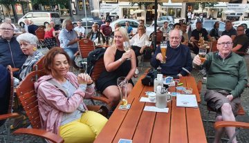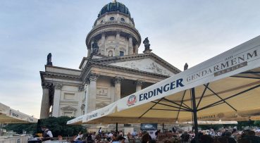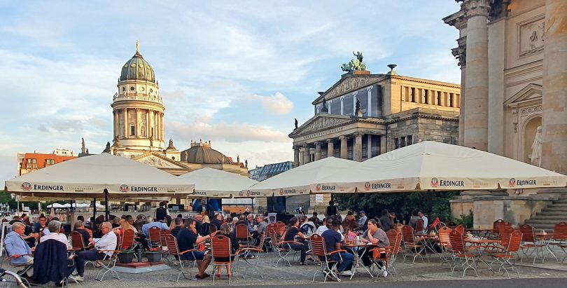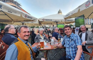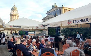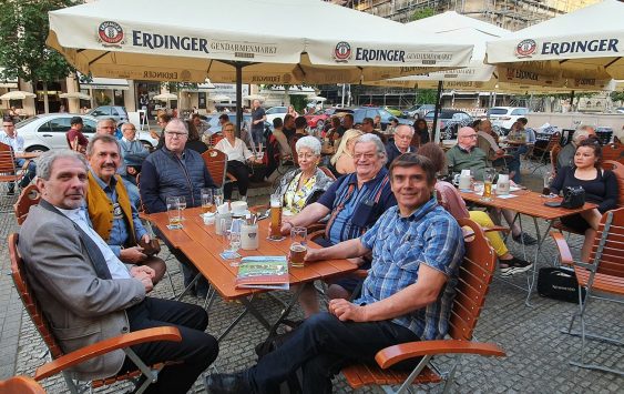 Zur Vorbereitung der Gespräche traf man sich am Vorabend im Biergarten des Erdinger Wirtshauses am Gendarmenmarkt mit Vertretern und Freunden des bayerischen Brauchtums in der Bundeshauptstadt. Mit zur Runde zählten der Erdinger-Bayernstammtisch mit Franz Schuhbauer, der Vorsitzende vom Verein der Bayern in Berlin, Helmut Amberger, sowie das „Fremdenführerteam Hartfiel“, Tina & Manfred & Micha. Es war eine Atmosphäre der Erleichterung, nach nahezu eineinhalb Jahren der Corona-Beschränkungen wieder offen zusammenzukommen, dazu bei schönstem Sommerwetter, auf dem schönsten Platz von Berlin, mit kühlem Erdinger Weißbier und einer deftigen bayerischen Brotzeit.