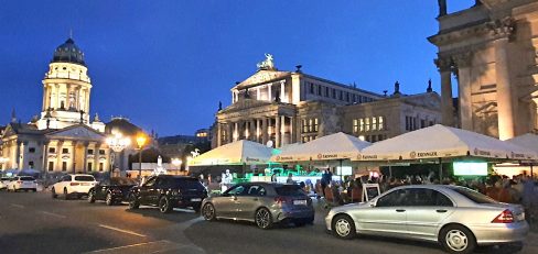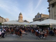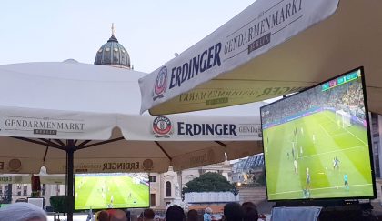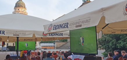 Auf Monitoren konnte auf der Terrasse des Französischen Doms das EM-Auftaktspiel der deutschen Nationalmannschaft gegen Frankreich unter freiem Himmel verfolgt werden. Auch wenn der Auftakt der Deutschen unglücklich in einer Niederlage endete,  so tat diese dem stimmungsvollem Abend keinen Abbruch.  Schließlich stehen ja noch zwei Spiele aus, um das Blatt zu wenden.