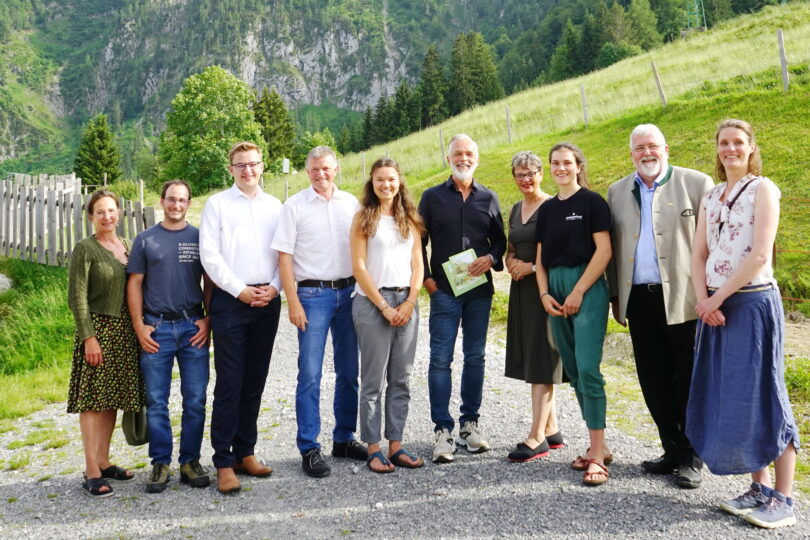 Bericht: Chiemsee-Alpenland Tourismus – Foto 1 (v.l.): Katharina Kern, Kreisbäuerin Rosenheim; Christian Tegethoff, Almfachberater AeLF Rosenheim; Christoph Schneider, Präsident Euregio Inntal – Chiemsee – Kaisergebirge – Mangfalltal; Hubert Wildgruber, Almerer und Initiator; Sarah Müllinger, Projektmanagement Aktiv Chiemsee-Alpenland Tourismus; Georg Hörhager, Obmann Tourismusverband Kufsteinerland; Sabine Mair, Geschäftsführerin Tourismusverband Kufsteinerland; Lina Schneeweiß, Themenmanagement Sport, Natur und Vitalität Tourismusverband Kufsteinerland; MdL Sebastian Friesinger; Eva-Maria Cattoen, LechtAlps © Chiemsee-Alpenland Tourismus