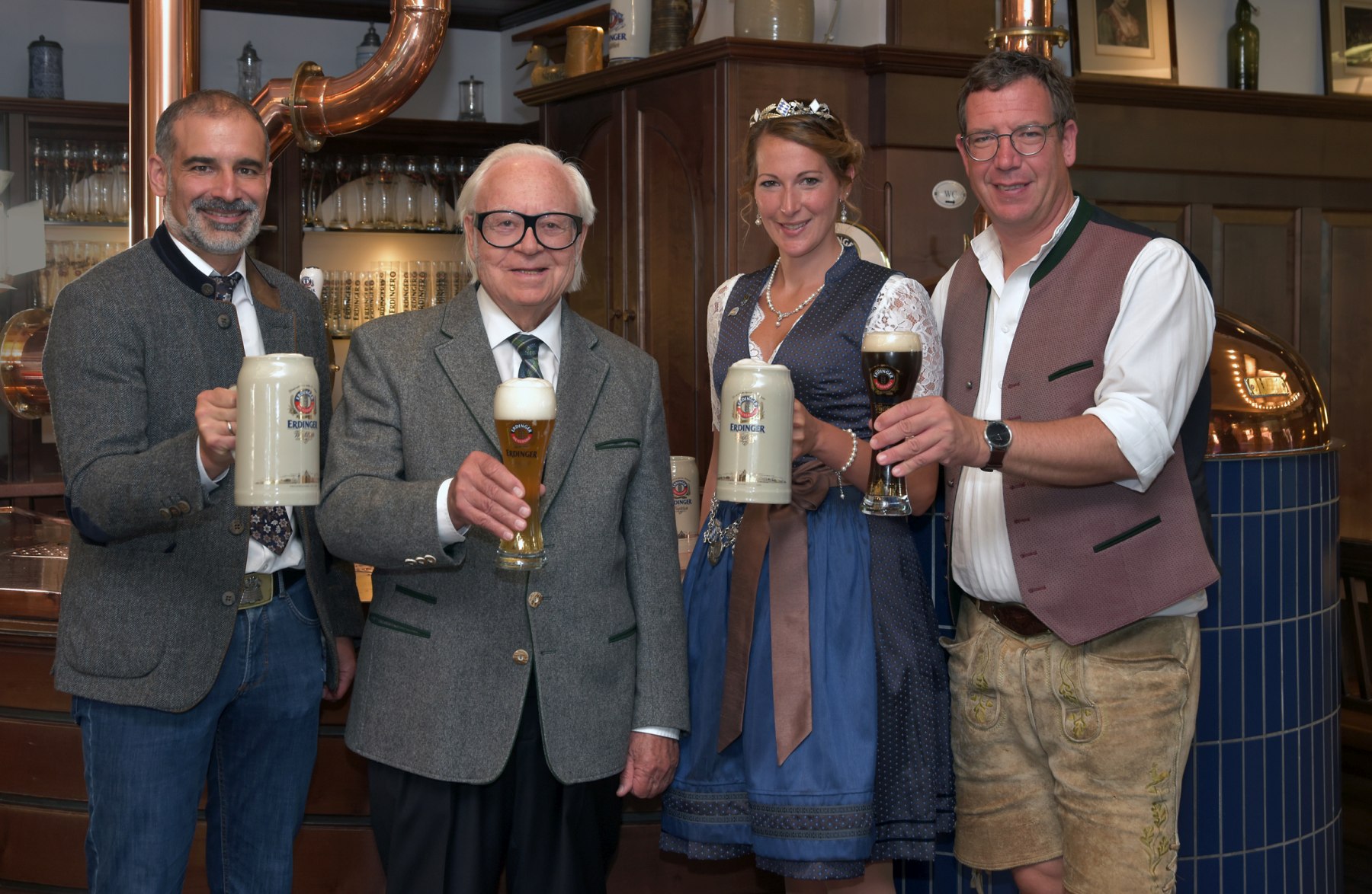 (v. l. n. r.): Nach einer kurzweiligen Führung durch die Brauerei stießen Dr. Stefan Kreisz (Geschäftsführer Technik, Logistik, Personal und Einkauf ERDINGER Weißbräu), Werner Brombach (Inhaber ERDINGER Weißbräu), Sarah Jäger (11. Bayerische Bierkönigin) und Wolfgang Kuffner (Leiter Gesamtmarketing ERDINGER Weißbräu) gemeinsam im Besucherzentrum der Brauerei an.