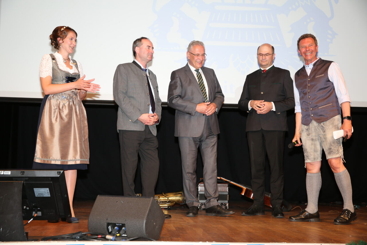 Bayerische Bierkönigin Sarah Jäger, Staatsminister Hubert Aiwanger, Staatsminister Joachim Herrmann, Staatsminister Albert Füracker, Moderator Roman Röll