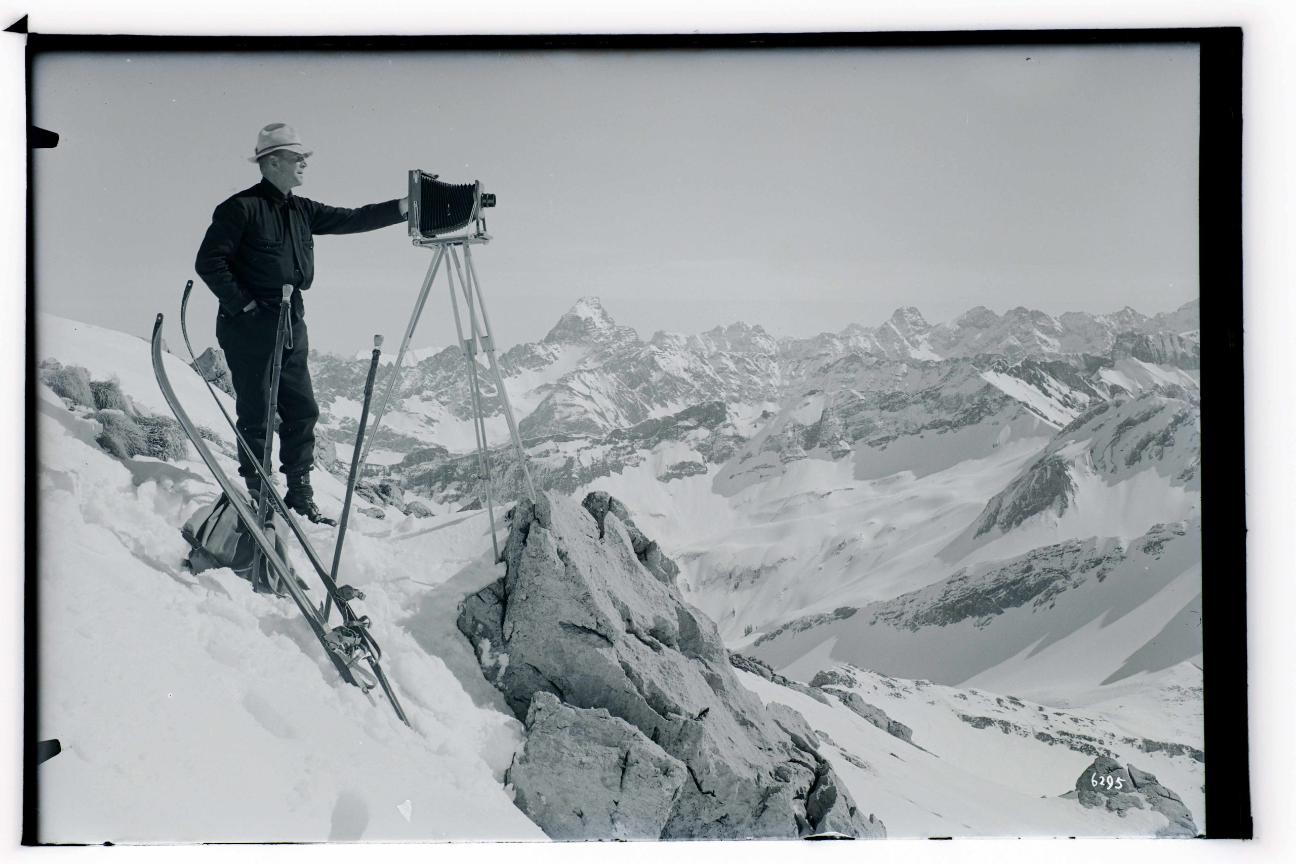 © Fotostudio Heimhuber, Sonthofen Das ist die „Welt“ des Hochtouren-Fotografen Eugen Heimhuber. Skitour auf das gut 2.200 m hohe Nebelhorn, den Oberstdorfer Hausberg. Natürlich mit Balgenkamera und Stativ, mit Glasplatten im Rucksack. Mehr als 18.000 Aufnahmen hat er so gemacht. Bruder Fritz war mit Begleiter 1901 die Wintererstbesteigung gelungen.