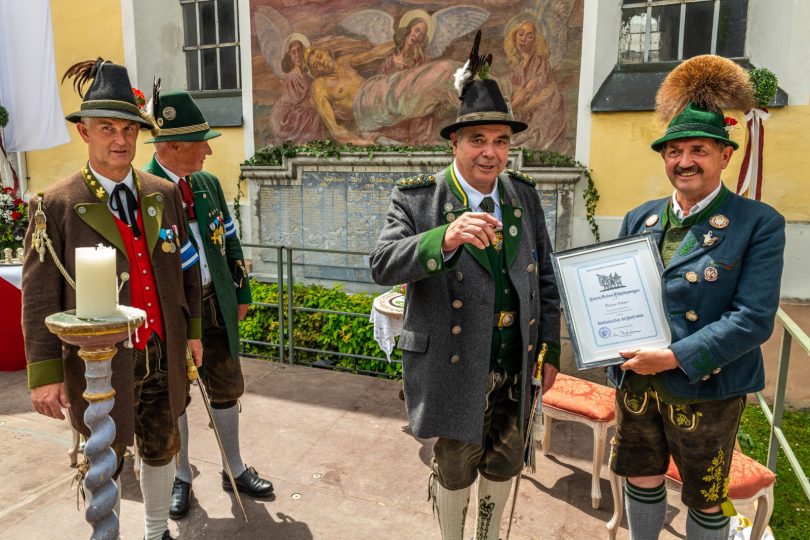 Fotos: Rainer Nitzsche – 1. Von links: Neubeuerns Hauptmann Josef Stadler, Schatzmeister Günter Reichelt vom Bund der Bayerischen Gebirgsschützen, Landeshauptmann Martin Haberfellner und Anton Hötzelsperger 2. Anton Hötzelsperger und Martin Haberfellner