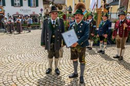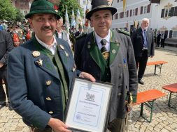 Neubeuern – Die seltene Auszeichnung „Presse-Löwe“ des Bundes der Bayerischen Gebirgsschützen hat Landeshauptmann Martin Haberfellner beim 36. Bataillonsfest des Inn-Chiemgaus in Neubeuern an Anton Hötzelsperger verliehen. Der Pressesprecher des Bayerischen Trachtenverbandes, Redakteur der Samerberger Nachrichten und freie Journalist erhielt die Nadel und Urkunde in Würdigung für die langjährige und gute Zusammenarbeit. „Wie wir uns in der Öffentlichkeit zeigen, das liegt an uns selbst, wie aber über uns berichtet wird, das liegt bei Dir in guten Händen“ – so der Landeshauptmann bei der Ehrung in Neubeuern.