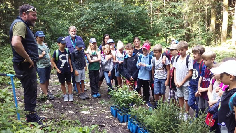 Foto: Linda Brüggemann – Bildunterschrift: Förster Anton Burkhart unterstützt Schülerinnen und Schüler beim Baumpflanzen.