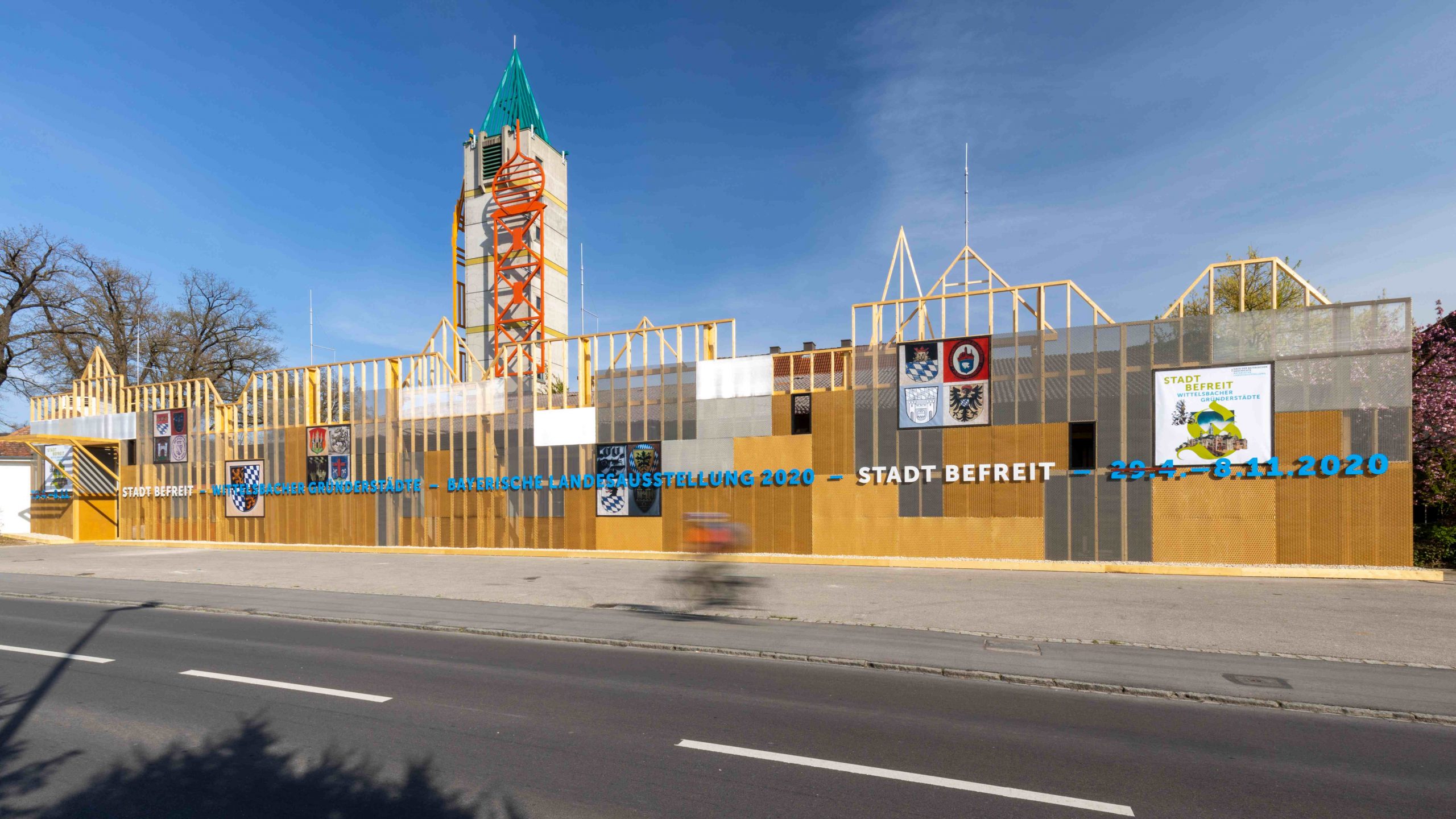 Der Schlauchturm des ehemaligen Feuerwehrhauses ist schon von weitem mit seinen Türmen und der Turmspitze als Ausstellungsort erkennbar. Streckmetallflächen und Fachwerkgiebel zieren die Außenfassade des FeuerHauses © Haus der Bayerischen Geschichte | Fotos: Herbert Rath