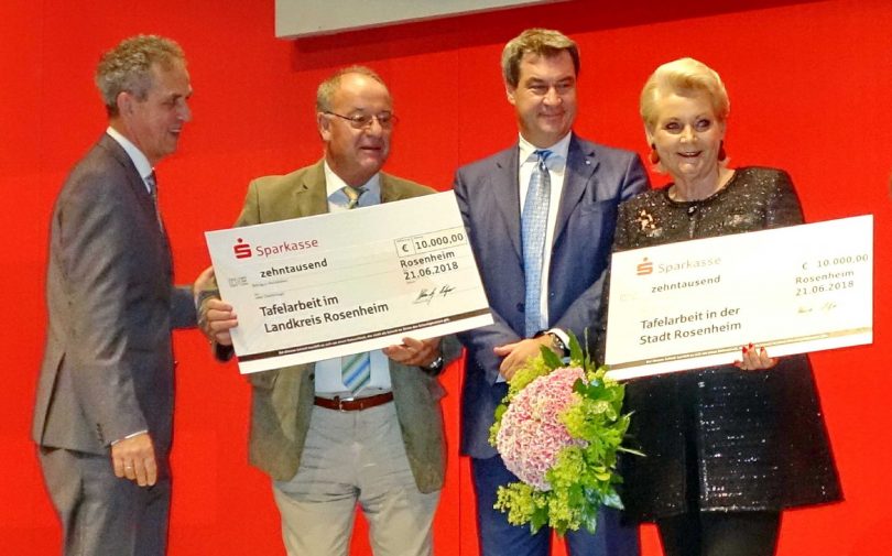 Mit 2 x 10.000 Euro aus dem Reinertrag ihrer Gewinnsparlotterie Sparkassen-PS-Sparen und Gewinnen unterstützen die bayerischen Sparkassen die Arbeit von Einrichtungen in Stadt und Landkreis Rosenheim, die Lebensmittel einsammeln und an wirtschaftliche benachteiligte Bürgerinnen und Bürger ausgeben. Die Spenden überreichte der Präsident des Sparkassenverbandes Bayern, Dr. Ulrich Netzer, anlässlich des Bayerischen Sparkassentags 2018 in Rosenheim stellvertretend für die begünstigten Organisationen an die Oberbürgermeisterin Gabriele Bauer und den Landrat Wolfgang Berthaler.