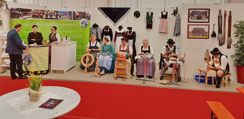 Mit einem eigenen Informationsstand präsentierte sich der Bayerische Trachtenverband in den ersten Tagen auf der Messe Rosenheim. Dabei gab es nicht nur persönliche Auskünfte und Informationen in gedruckter Form, sondern auch handwerkliche Vorführungen, am Samstag zum Beispiel mit Spinnen, Klöppeln, Stricken, Edelweiß-Schnitzen und Federkielsticken. Auf großes Interesse stießen -wie die Standleiter Walter und Anneliese Weinzierl bekanntgaben- die Publikationen und Angebote des Bayerischen Trachtenverbandes, unter anderem zum Trachtenkulturzentrum im niederbayerischen Holzhausen. Gerne angenommen wurden auch die vielen Termine 2019, unter anderem zum heurigen Trachtensommer mit den Gautrachtenfesten in Altötting, Bernau a. Chiemsee und Pang bei Rosenheim.