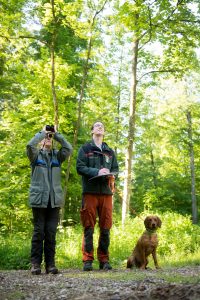 Zwei Foerster der LWF beurteilen den Nadelverlust einer Fichte im Rahmen der Waldzustandserhebung mit dem Fernglas. Mittels Fernglas wird die Lichtkrone der Baeume beurteilt. Dabei sind die Anzahl der Nadeljahrgaenge sowie Schaeden besonders zu betrachten.
