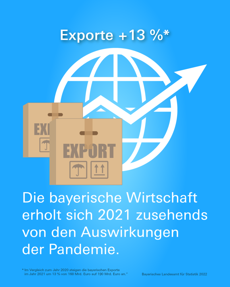 Trotz einer Abnahme von gut sechs Prozent auf 19,9 Milliarden Euro gegenüber 2019 sind die Vereinigten Staaten von Amerika 2021 weiterhin das wichtigste Exportland für bayerische Waren. „Maschinen“, „Personenkraftwagen und Wohnmobile“ sowie „medizinische Geräte und orthopädische Vorrichtungen“ sind mit einem Anteil von zusammen gut 47 Prozent die wichtigsten Exportgüter.