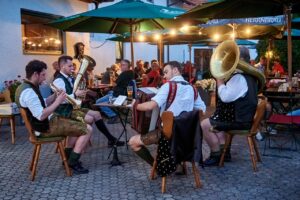 Die Gruppe „Altbairisch Blech“ sorgte mit der Wirtshausmusi am Donnerstag der Bayerischen Woche für zünftige Stimmung, wie hier beim Alten Wirt. Foto: TI Bad Gögging | Foto Mayer