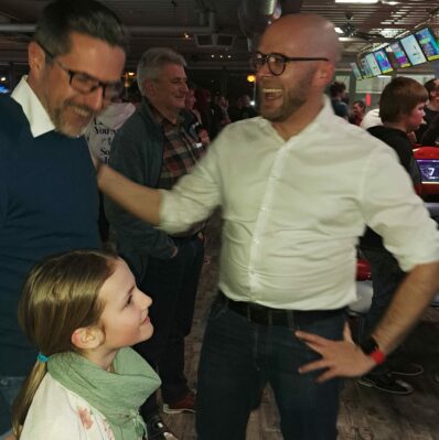 Gekommen waren auch der Landtagsabgeordnete Sepp Lausch mit seiner ganzen Familie und die Bezirksrätin Barbara Stein. Bei einer lockeren Fragestunde konnten die zahlreichen Besucher den jüngsten Minister der Staatsregierung kennenlernen und ihn zu bestimmten Themen „ausquetschen“. So war z.B. die viel diskutierte Abschaffung der Faxgeräte ein Thema. Mehring betonte, dass der Bürger weiterhin ein Fax an die Behörden senden dürfe, er aber darauf dränge, das in den Behörden das Fax nur mehr digital verarbeitet wird. Auch Fragen zur Künstlichen Intelligenz und der Beschleunigung von Verwaltungsvorgängen kamen. Aus dem Rosenheimer digitalen Gründerzentrum „Stellwerk 18“ waren einige junge Unternehmer gekommen, um sich mit dem Minister über fachliche Themen auszutauschen. Anschließend lud MdL Sepp Lausch noch zum Bowling auf Kosten der Freien Wähler ein. Dieses Angebot wurde ausführlich angenommen, auch der Minister lies es sich nicht nehmen und schob über eine Stunde Kugel um Kugel nach vorne. Er genoß es sichtlich mit den jungen Bürgerinnen und Bürgern Spaß zu haben und sich zwischen den Runden mit ihnen auszutauschen. Erst zu späterer Stunde ging ein bemerkenswerter Besuch eines Ministers in Rosenheim zu Ende, bei dem wieder bewiesen wurde, dass Politik auch Spaß machen kann und tatsächlich auch nah am Menschen ist.