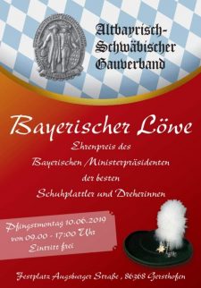 „Den Ehrenpreis des Bayerischen Ministerpräsidenten der besten Schuhplattler und Deandldreherinnen, besser bekannt als Bayerischer Löwe, wird dieses Jahr beim Altbayrisch-Schwäbischen Gauverband ausgetragen! Gemeinsam mit dem Trachtenverein Gersthofen würden wir uns sehr freuen, wenn nicht nur die teilnehmenden Trachtlerinnen und Trachtler dabei sind, sondern auch alle Interessierten und Zuschauer am Pfingstmontag, 10. Juni 2019, im Festzelt Binswanger am Gersthofer Festplatz vorbeischauen. Das Preisplattln und -drehen beginnt um 9 Uhr und findet zeitgleich in drei Wertungskreisen, getrennt nach Jugend, Deandl & Buam, statt. Anschließend gehts auf der Hauptbühne um die Gruppenwertungen.
