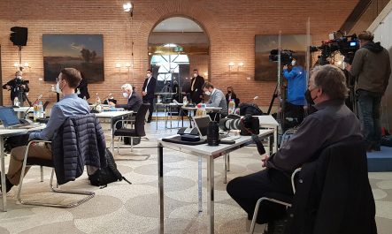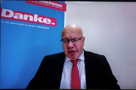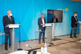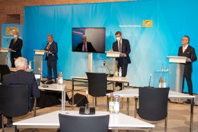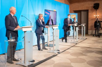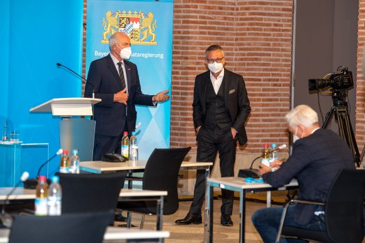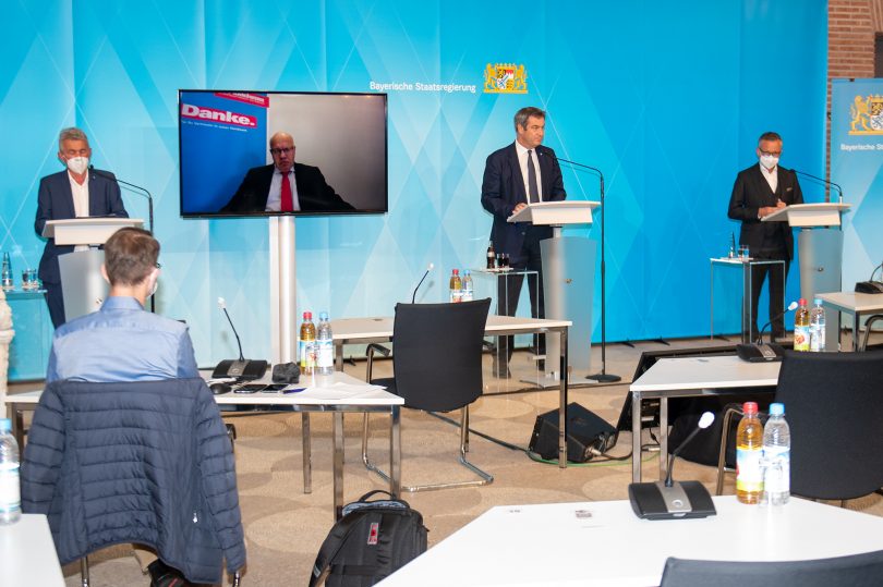 Über die wesentlichen Ergebnisse der Beratungen informierten Ministerpräsident Dr. Markus Söder, MdL, Bundesminister Peter Altmaier (zugeschaltet), Hauptgeschäftsführer der Vereinigung der Bayerischen Wirtschaft (vbw), Bertram Brossardt, der Präsident des Bayerischen Industrie- und Handelskammertages (BIHK), Prof. Klaus Josef Lutz, und der Präsident des Bayerischen Handwerkstages (BHT), Franz Xaver Peteranderl, im Rahmen einer Pressekonferenz im Foyer des Prinz-Carl-Palais.