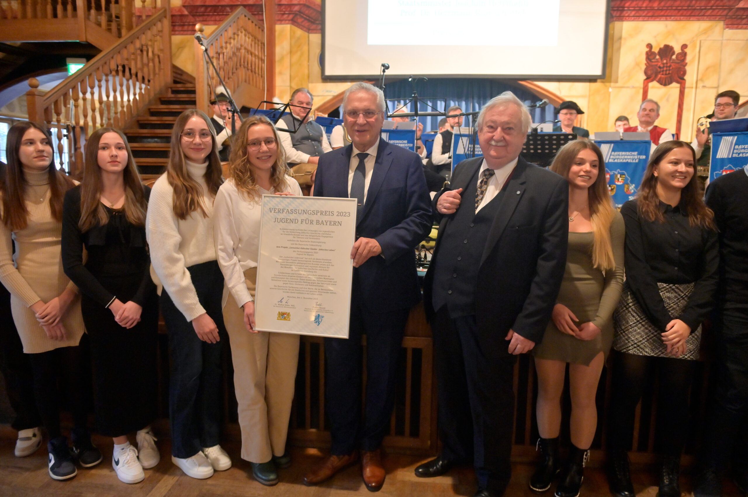 Preisübergabe durch Joachim Herrmann und Prof. Herrmann Rumschöttel an Dossenberger Gymnasium Günzburg