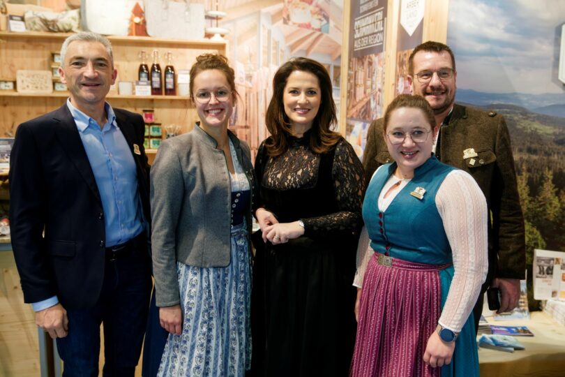 Titelbild: v.l.n.r. Dr. Ronny Reith, Maria Kraus, Tourismusministerin Michaela Kaniber, Thomas Pokorny und Elisabeth Unnasch auf dem Stand vom Arberland