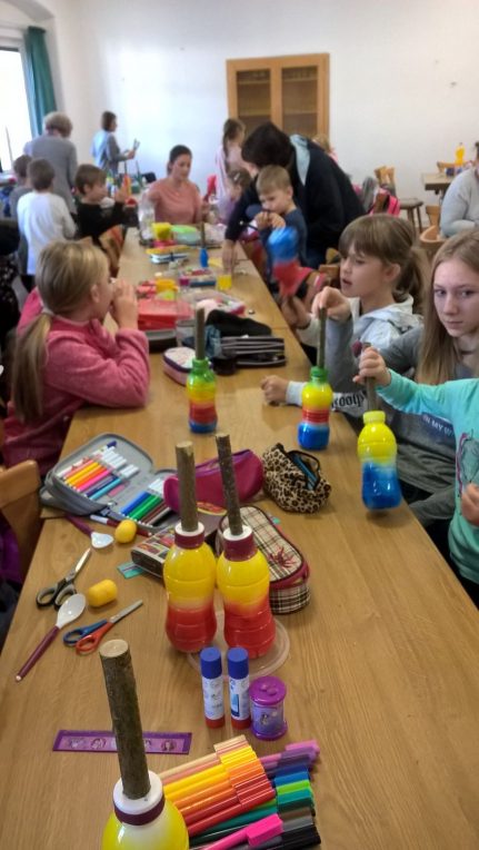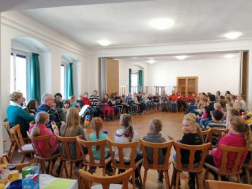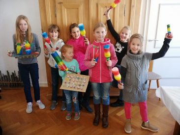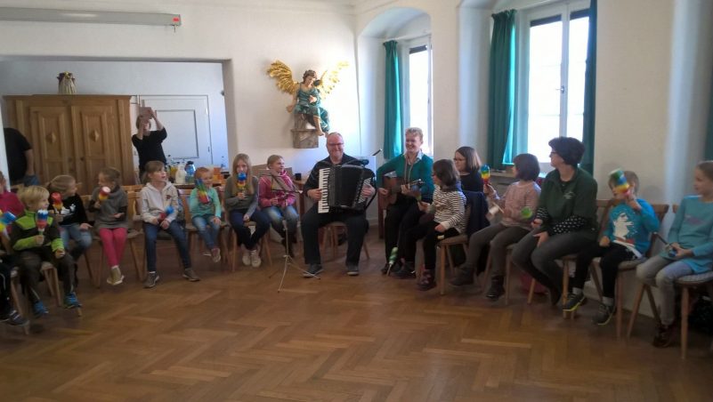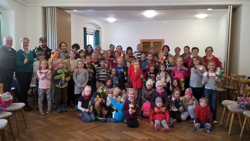 Der Pfarrsaal der Stadt Bad Kötzting zeigte sich dabei als idealer Veranstaltungsort. Gaujugendreferent Marco Peschl begrüßte die Kinder im Alter zwischen zwei und 12 Jahren und war sichtlich erfreut über so viel Teilnehmer. 2. Gauvorsitzender Adolf Breu war ebenso anwesend und überbrachte die Grüße der Vorstandschaft. Mit dem Lied „Griaß eng Gott“ begrüßte das Ehepaar Hupf die Kinder und alle stimmten fröhlich mit ein. Nach einer kurzen Vorstellungsrunde aller stellte schließlich Hermann Hupf die Instrumente vor, die gebastelt werden konnten, so zum Beispiel verschiedene Rasseln aus Kronkorken, Walnuss-Schalen, Dosen, Ü-Eier, Einwegflaschen usw.