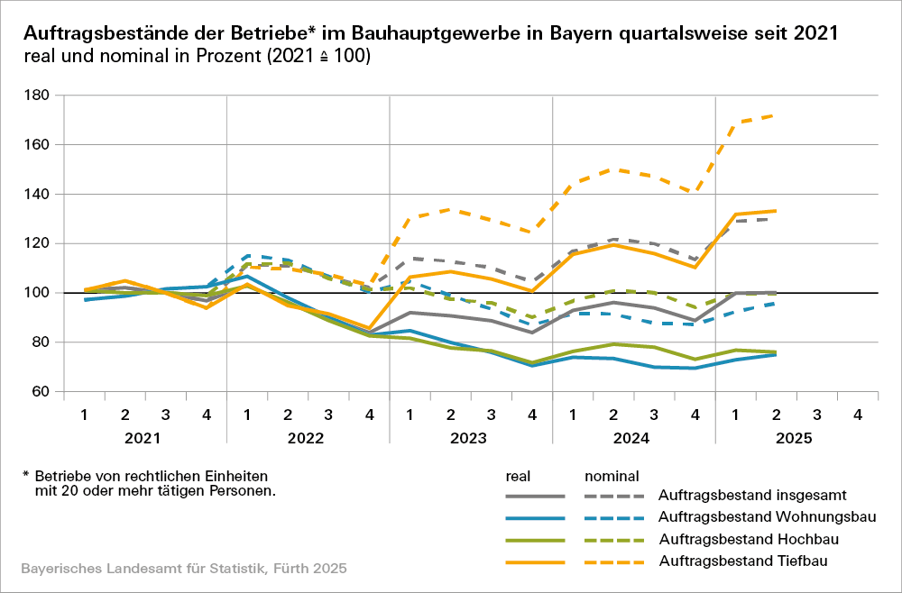 Ende Juni 2025 liegt der Auftragsbestand im bayerischen Bauhauptgewerbe bei einem Gesamtwert von 17,73 Milliarden Euro. Das entspricht einer Steigerung um 1,14 Milliarden Euro beziehungsweise 6,9 Prozent gegenüber dem Wert des Vorjahres. Real kann der Tiefbau seit 2021 deutlich zulegen mit einer Steigerung um etwa ein Drittel, der Auftragsbestand im Wohnungs- und Hochbau stagniert dagegen auf einem Niveau von rund 75 Prozent des betrachteten Basisjahres 2021.
