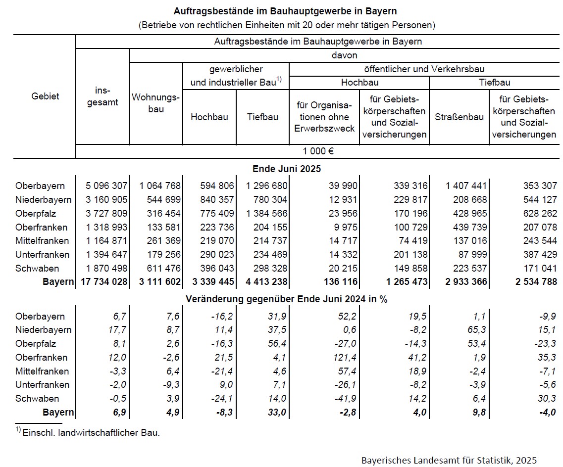 Vier der sieben bayerischen Regierungsbezirke verzeichnen Ende Juni 2025 insgesamt höhere Auftragsbestände als vor Jahresfrist. Die nominalen Zuwächse liegen dabei zwischen 6,7 Prozent in Oberbayern und 17,7 Prozent in Niederbayern. Rückläufige Auftragsbestände gegenüber Ende Juni 2024 werden für die bauhauptgewerblichen Betriebe in Mittelfranken mit 3,3 Prozent, in Unterfranken mit 2,0 Prozent und Schwaben mit 0,5 Prozent festgestellt.
