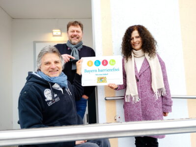 Bürgermeister Christoph Kraus, der Beauftragte der Gemeinde für Menschen mit Behinderung Sepp Höck und Büchereileiterin Sylvie Richtaryk durften jetzt das offizielle Schild „Bayern barrierefrei“ entgegennehmen – entsprechend groß war die Freude über die Anerkennung der Bemühungen um die Barrierefreiheit. „Ich bin sehr froh, dass mit der Schaffung des barrierefreien Zugangs nun die letzte Hürde genommen wurde und die Gemeindebücherei mit dem Signet „Bayern barrierefrei“ ausgezeichnet wurde. Wichtiger als das Schild ist aber natürlich die Tatsache, dass jetzt Menschen mit körperlichen Beeinträchtigungen genauso wie Familien mit Kinderwägen die Bücherei barrierefrei nutzen können.“, so Bürgermeister Kraus. Auch Sepp Höck freute sich über die Auszeichnung ebenso wie die endgültige Umsetzung des Projektes, das er zusammen mit Vertretern der Projektgruppe „Barrierefreies Bauen in Stadt und Landkreis Rosenheim“ ganz maßgeblich mitgestaltet hatte: „Jetzt können auch Menschen mit körperlichen Beeinträchtigungen die Bücherei barrierefrei nutzen – ich freue mich selbst schon auf meine erste Ausleihe.“