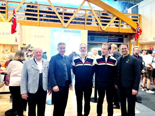 Heuer koordinierte Rosenheims Bayernbund-Kreisvorsitzender Christian Glas eine Delegation aus den Reihen des Bayernbundes und vom Landkreis Rosenheim für einen Besuch am Norwegen-Stand. Mit dabei waren Landrat Otto Lederer, Oberbürgermeister Andreas März, Vertreter der drei Rosenheimer Brauereien Auerbräu, Flötzingerbräu und Maxlrainer, Günther Frey als Landesvorsitzender des Bayerischen Trachtenverbandes, Pater Lukas von der Abtei Scheyern sowie mehrere Bürgermeister aus dem Landkreis Rosenheim. Die Delegation bestand aus rund 30 Personen. Konstantin Zimmermann, vom Furset Catering/Oslo begrüßte die Rosenheimer Delegation überaus herzlich und kredenzte kulinarische Köstlichkeiten seines Landes. Bei den Gesprächen entwickelten sich wirtschaftliche Überlegungen, insbesondere mit den drei Rosenheimer Brauereien. Gute Grspräche zw. den Verantwortlichen und Brauereien aus dem Landkreis durften nicht fehlen.