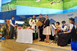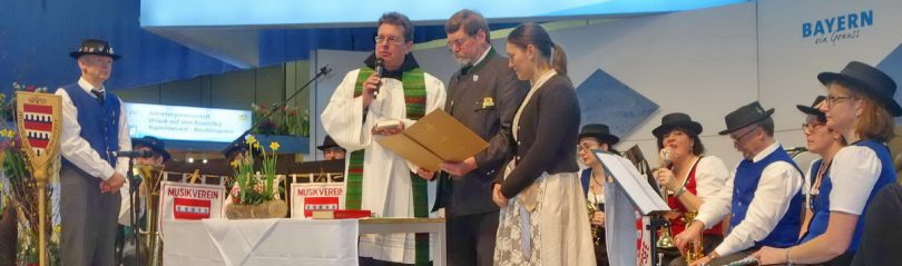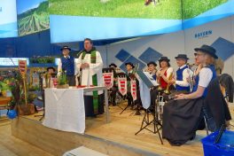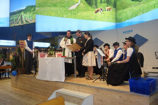 “Bei all dem, was uns eine so große Messe wie die Internationale Grüne Woche in Berlin abverlangt, wollen und dürfen wir den Herrgott nicht vergessen, er ist nämlich immer mit uns und an unserer Seite” – mit diesen Worten begann Pater Lukas Wirth vom Kloster Scheyern erstmalig einen Wortgottesdienst in der Bayernhalle des Berliner Messegeländes. Noch vor Öffnung der Messetore fanden sich die Aussteller und Mitarbeiter in der Bayernhalle ein, um inne zu halten und den Sonntag zu ehren. Die musikalische Gestaltung übernahmen Bläser aus den Reihen der Musikkapelle Schnaitsee aus dem Landkreis Traunstein.